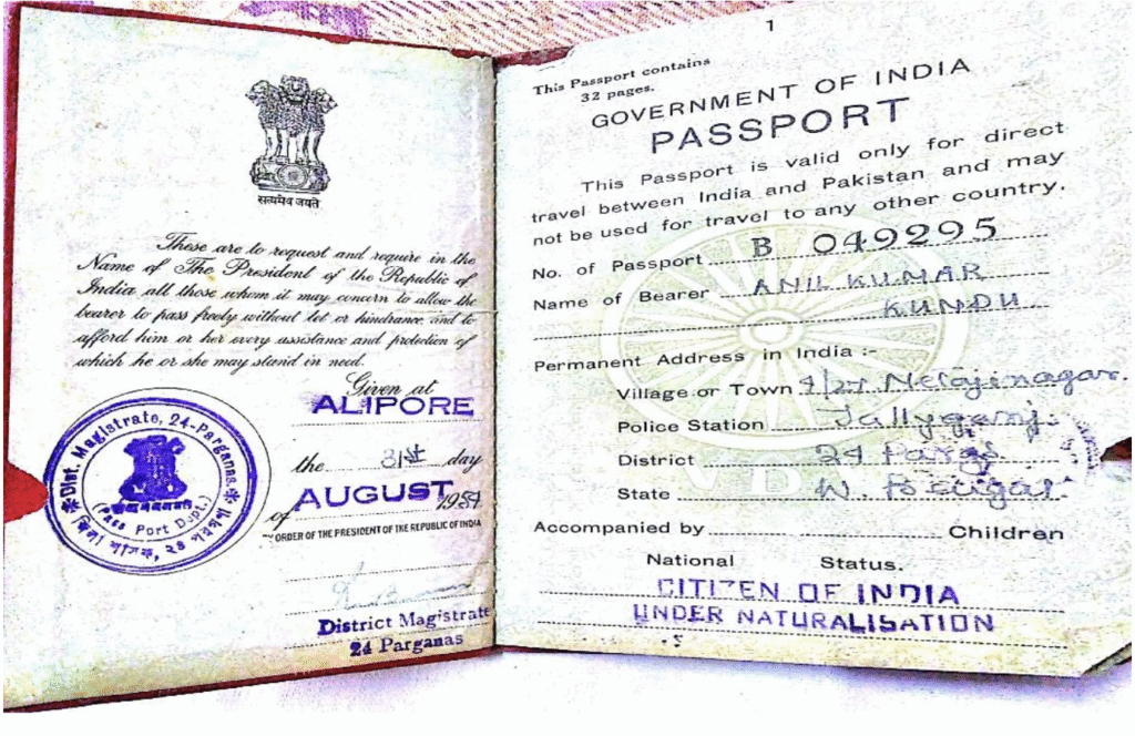 Pictured: The 1952 passport issued to Anil Kumar Kundu. Image courtesy Sumallya Mukhopadhyay
